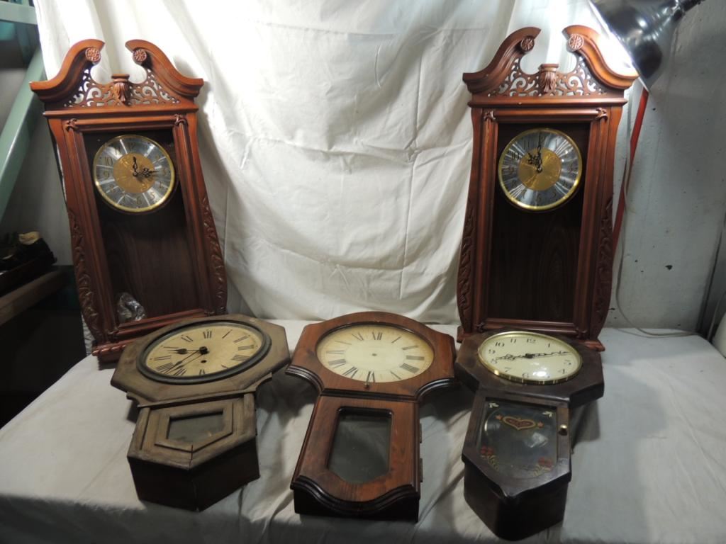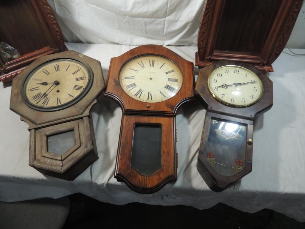 NEEDS REPAIRS, CASES, PARTS, DECORATIVE WOODEN WALL CLOCKS, VINTAGE CLOCKS, AS SHOWN SEE PHOTO FOR MORE DETAILS.