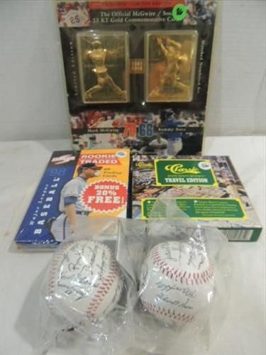 LOT 5 BASEBALL COLLECTIBLES: MCGWIRE & SOSA 23KT GOLD CARDS, 2 1983 WHITE SOX FACSMILE SIGNED BASEBALLS, 1998 SCORE ROOKIE TRADED AND CLASSIC TRAVEL GAME. A SSHOWN. VIEW PICTURE FOR DETAIL.