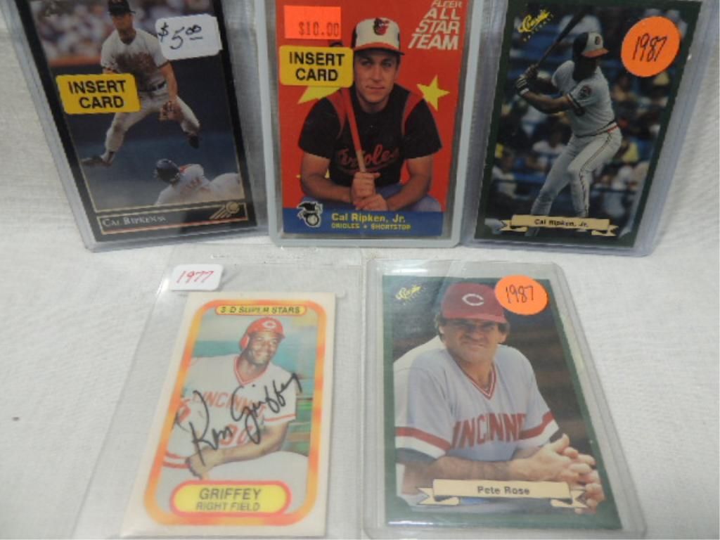 LOT 5 CAL RIPKEN 1986 FLEER & 1992 LEAF BASEBALL CARDS. 1987 CLASSIC #1 BASEBALL PLAYER CARD PETE ROSE, 1987 CLASSIC #52 BASEBALL PLAYER CARD CAL RIPKEN JR & 1977 XOGRAPH #49 3-D BASEBALL CARD KEN GRIFFEY JR. AS SHOWN. VIEW PICTURE FOR DETAIL.