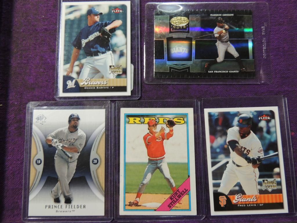 FRED LEWIS, KURT STILLWELL, PRINCE FIELDER, MARQUIS GRISSOM, DENNIS SARFATE, BASEBALL CARD. TRADING CARD. MIXED MAKERS MIXED DATES. COLLECTIBLE. VINTAGE CARD. PROTECTIVE PLASTIC SLEEVE. AS SHOWN. SEE PHOTO FOR MORE DETAILS.