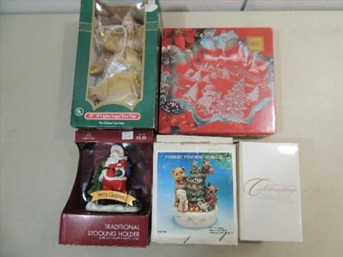LOT 5 CHRISTMAS DECORATION: STOCKING HOLDER, ANGEL TREE TOPPER, CERAMIC MUSIC BOX, PRAYING ANGEL. AS SHOWN. VIEW PICTURE FOR DETAIL.