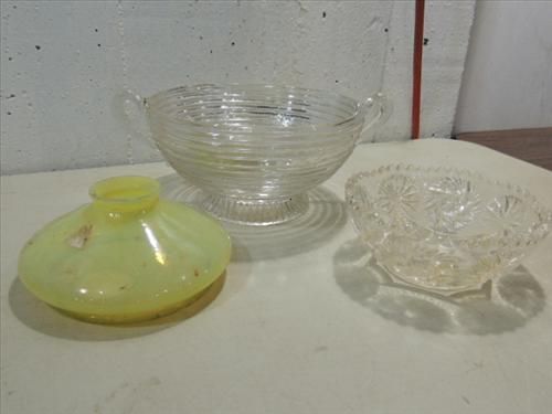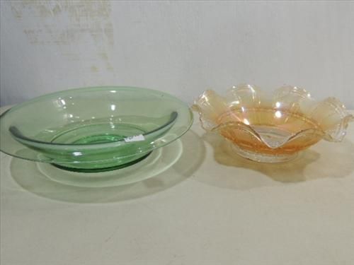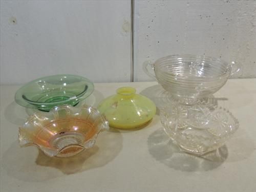 LOT 5 COLLECTIBLE VINTAGE GLASSWARE: MANHATTEN PUNCH BOWL, VASELINE GLASS SHADE, GREEN GLASS BOWL, AMBER CARNIVAL GLASS BOWL & PRESS GLAS BOWL. AS SHOWN. VIEW PICTURE FOR DETAIL.