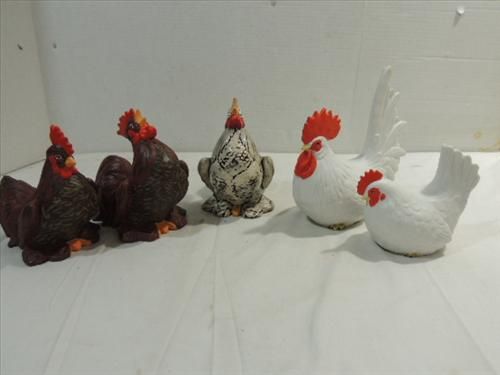 LOT 5 CONTEMPORARY CERAMIC ROOSTER & HENS. THE WHITE SET IS LEFTON. AS SHOWN. VIE WPICTURE FOR DETAIL.