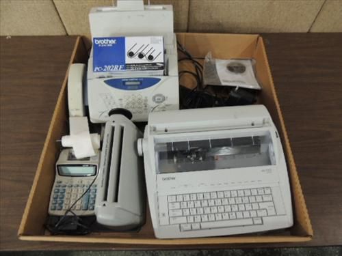 LOT 5 ELECTRONIC OFFICE EQUIPMENT: MARTIN YALE PAPER FOLDER, BROTHER INTELLIFAX MACHINE, BROTHER TYPEWRITER, CALCULATOR AND SURGE PROTECTOR. AS SHOWN. VIEW PICTURE FOR DETAIL.