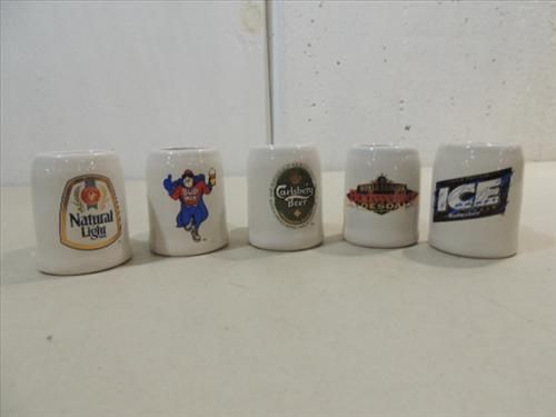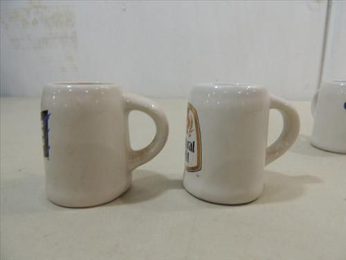 LOT 5 ESPEJO S.A. CHILE CERAMIC MINI BEER MUGS: BUD, BUDWEISER, NATURAL LIGHT, CARLSBERG, BUD ICE. AS SHOWN. VIEW PICTURE FOR DETAIL.