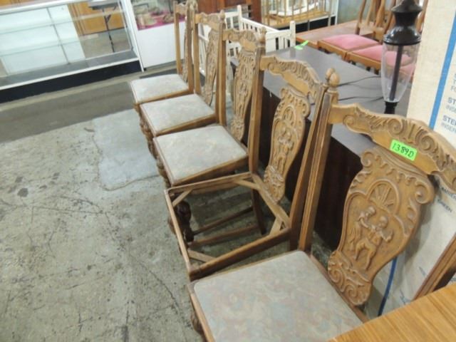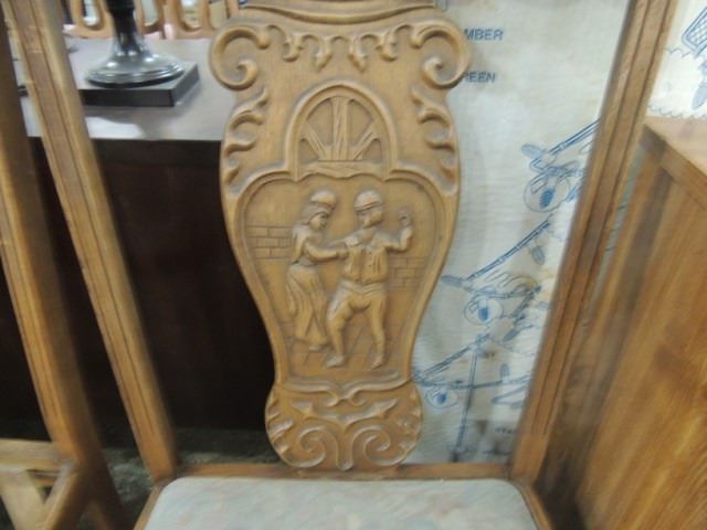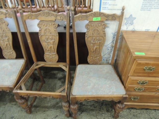 NICE OAK CHAIRS, WITH PRINTED CLOTH SEATS, AS SHOWN. I CHAIR MISSING THE SEAT.