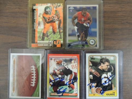 LOT 5 FOOTBALL AUTOGRAPH PLAYER CARDS: TIM KRUMRIE, TIM KRUMRIE, ATHONY ALLEN, DAMIEN BERRY. NO COA. AS SHOWN. VIEW PICTURE FOR DETAIL. PLEASE BE ADVISED, AND INFORMED REGARDING SIGNATURES OR AUTOGRAPHS THAT WE SELL AT AUCTION: WE ARE NOT AUTHENTICATORS, AND WE DO NOT AUTHENTICATE, OR VALIDATE ANY AUTOGRAPHS OR SIGNATURES THAT WE OFFER AT AUCTION. SOME AUTOGRAPHS OR SIGNATURES MAY COME WITH AN AUTHENTICATION FROM ANY ONE OF LITERALLY HUNDREDS OF AUTHENTICATORS ACROSS THE COUNTRY, AND AROUND THE WORLD. WE DO NOT ENDORSE ANY AUTHENTICATOR, NOR DO WE GUARANTEE THAT ANY AUTOGRAPH OR SIGNATURE IS AUTHENTIC, OR THAT IT WILL PASS AUTHENTICATION BY ANY AUTHENTICATOR. ALL AUTOGRAPHS OR SIGNATURES ARE SOLD