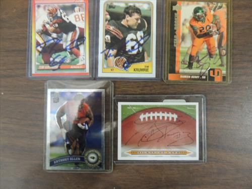 LOT 5 FOOTBALL AUTOGRAPH PLAYER CARDS: TIM KRUMRIE, TIM KRUMRIE, ATHONY ALLEN, DAMIEN BERRY. NO COA. AS SHOWN. VIEW PICTURE FOR DETAIL. PLEASE BE ADVISED, AND INFORMED REGARDING SIGNATURES OR AUTOGRAPHS THAT WE SELL AT AUCTION: WE ARE NOT AUTHENTICATORS, AND WE DO NOT AUTHENTICATE, OR VALIDATE ANY AUTOGRAPHS OR SIGNATURES THAT WE OFFER AT AUCTION. SOME AUTOGRAPHS OR SIGNATURES MAY COME WITH AN AUTHENTICATION FROM ANY ONE OF LITERALLY HUNDREDS OF AUTHENTICATORS ACROSS THE COUNTRY, AND AROUND THE WORLD. WE DO NOT ENDORSE ANY AUTHENTICATOR, NOR DO WE GUARANTEE THAT ANY AUTOGRAPH OR SIGNATURE IS AUTHENTIC, OR THAT IT WILL PASS AUTHENTICATION BY ANY AUTHENTICATOR. ALL AUTOGRAPHS OR SIGNATURES ARE SOLD