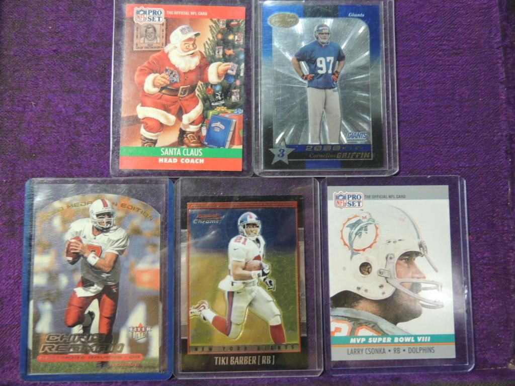 CORNELIUS GRIFFIN, SANTA CLAUS, LARRY CSONKA, TIKI BARBER, CHRIS REDMAN, FOOTBALL PLAYER CARDS. ASSORTED TRADING CARDS. MIXED MAKERS AND MIXED YEARS. COLLECTIBLE. GREAT CONDITION. AS SHOWN. SEE PHOTO FOR MORE DETAILS.