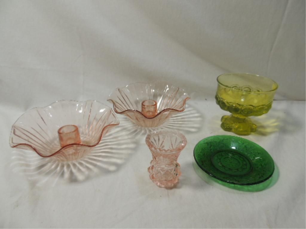 CUT CLASS. BOWL CANDLES HOLDERS PAIR. VASILINE BOWL. SMALL GREEN CLASS DISH.