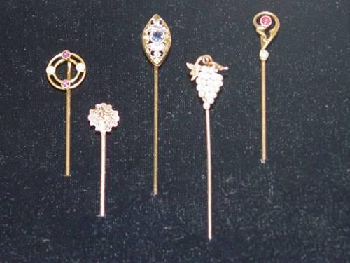 LOT (5) GOLD STICK PINS - 1 W/ SAPPHIRE, 3 W/ PEA