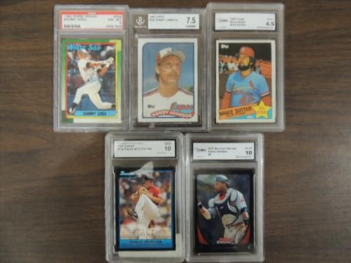 LOT 5 GRADED BASEBALL CARDS: 2005 BOWMAN #FG19 BASEBALL ROOKIE CARD PHILIP HUGHES. GRADED GEM 10 BY PGA, 2011 BOWMAN CHROME #6 GRADED BASEBALL CARD CARLOS SANTANA. GRADED GEM MT 10 BY GMA, 1985 TOPPS #722 GRADED BASEBALL CARD BRUCE SUTTER. GRADED VG-EX 4.5 BY GMA, 1990 TOPPS #692 GRADED BASEBALL CARD SAMMY SOSA. GRADED NM-MT 8 BY PSA, 1989 TOPPS #647 GRADED BASEBALL CARD RANDY JOHNSON. GRADED NR-MT 7.5 BY BCCG. AS SHOWN. VIEW PICTURE FOR DETAIL.
