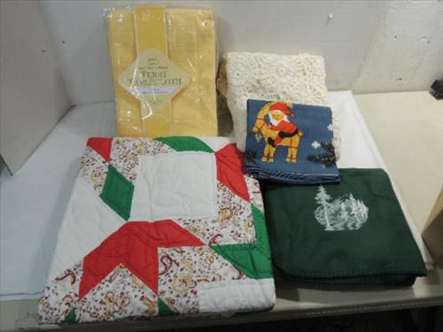LOT 5 ITEMS: 1 MACHINE MADE QUILT, 4 TABLE CLOTHS. A HOLIDAY TOPICAL TABLE CLOTH. AS SHOWN. VIEW PICTURE FOR DETAIL.