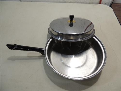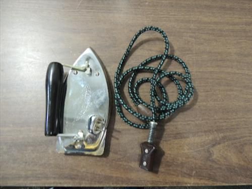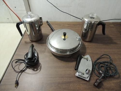 LOT 5 KITCHEN WARE: 2 STOVE TOP COFFEE POTS, 1 STAINLESS STEEL FRYING PAN, 2 VINTAGE IRONS. AS SHOWN. VIEW PICTURE FOR DETAIL.