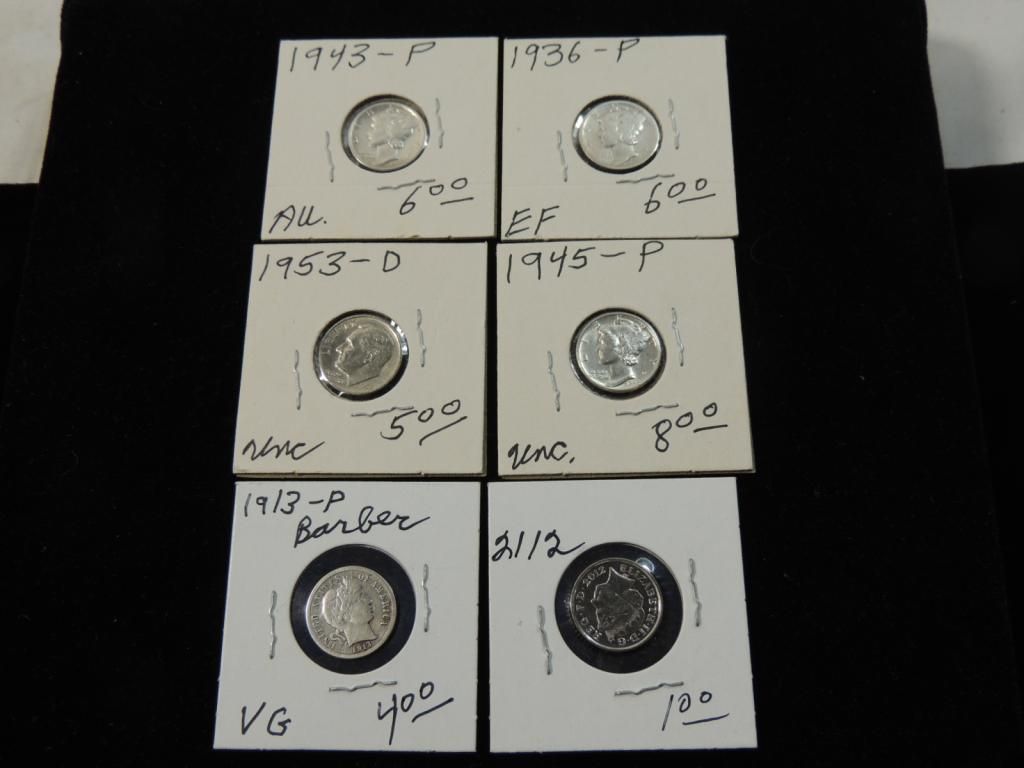 1913 BARBER DIME VG, 1936 MERCURY DIME EF, 1943 MERCURY DIME AU, 1945 MERCURY DIME UNC, 1953 MERCURY DIME UNC. AS SHOWN. SEE PHOTO FOR MORE DETAILS.