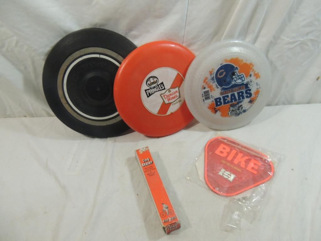 CHICAGO BEARS FRISBEE, TOURNAMENT MODEL FRISBEE, DUNKIN HINES PROMOTIONAL FRISBEE TIRE SEALER BIKE CAUTION SIGN, AS SHOWN SEE PHOTO FOR MORE DETAILS.