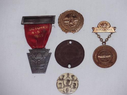 LOT (5) MISC. FIRE RELATED ITEMS: CAIRNS HELMET DISC NY, CELLULOID 1898 MERRIMAC ST. FIRE-BOSTON, 22ND CONVENTION M.S.F.A. 1927, M.S.A. CONVENTION 19 OZ. MEDAL, and MEDAL W/ RIBBON 1921 CONVENTION WILKES BARRE PA - WEAR, MEDAL LOSSES;