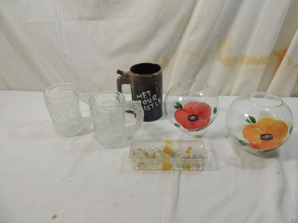 LOT 5 MISC GLASSWARE MUGS, PAINTED VASES