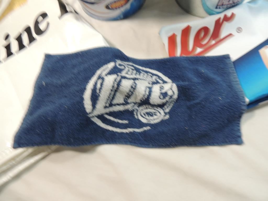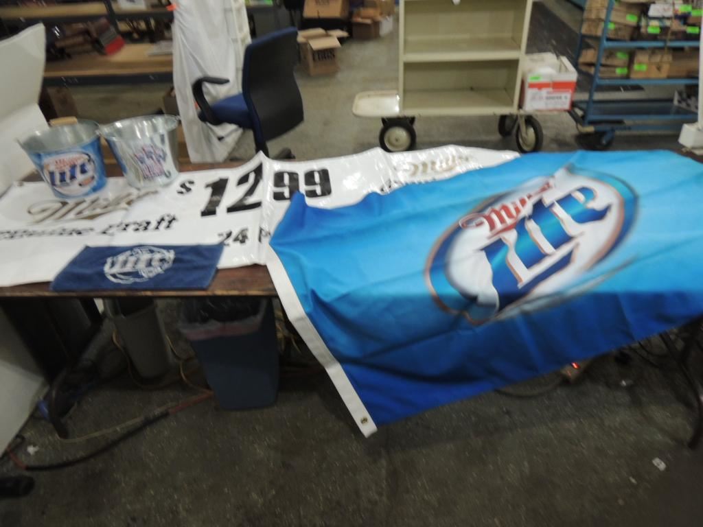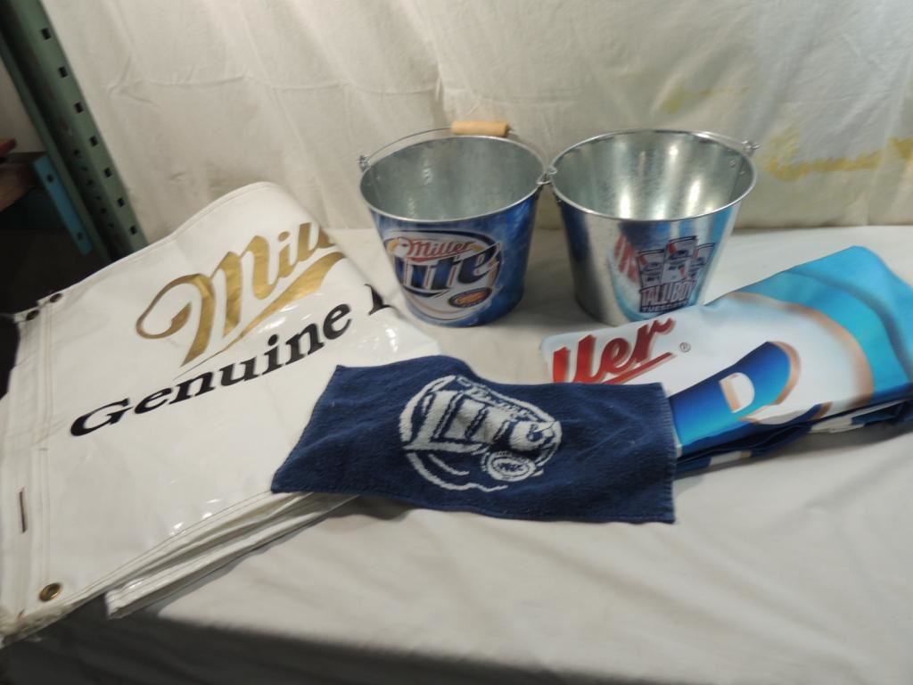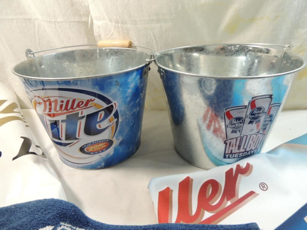 METAL BUCKETS, MILLER LITE TOWEL, MILLER LITE FLAG, PROMOTIONAL BANNER, PABST PAIL BREWIANA AS SHOWN SEE PHOTO FOR MORE DETAILS