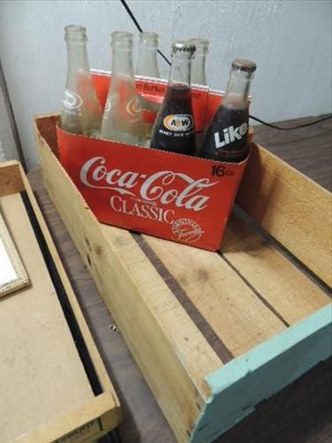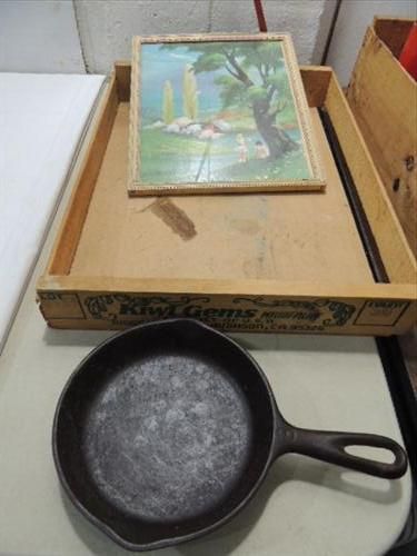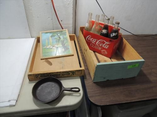 LOT 5 MIXED COLLECTIBLES: 2 WOODEN CRATES, #3 CAST IRON SKILLET, VINTAGE SODA BOTTLES AND FRAMED PRINT. AS SHOWN. VIEW PICTURE FOR DETAIL.
