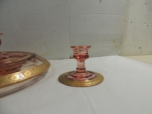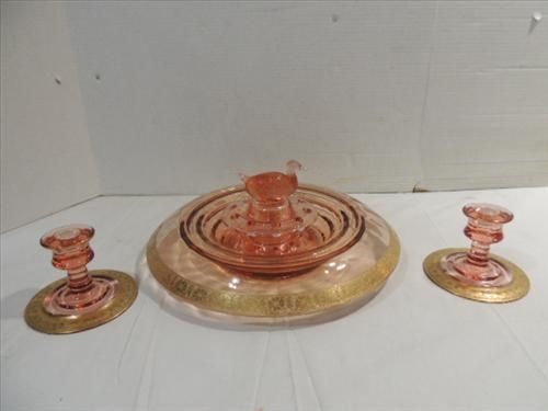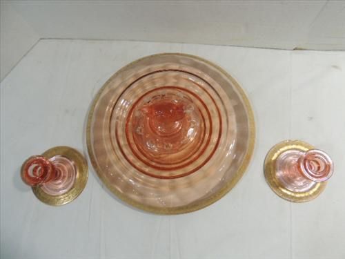 LOT 5 PIECE CENTER SET RARE VINTAGE PINK DEPRESSION & GOLD TRIM. 2 CANDLE HOLDERS & BOWL WITH CENTER RELISH FORK HOLDER. 14"D. AS SHOWN. VIEW PICTURE FOR DETAIL.