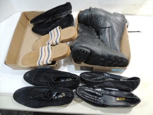 LOT 5 PAIR SLIPPERS SIZE 11.5 , WOOD KLAKS SIZE 11, 2 PAIR DRESS SHOES SIZE 11 & PAIR OF ALL WEATHER RUBBER INSULATED BOOTS: SIZE 8. AS SHOWN. VIEW PICTURE FOR DETAIL.