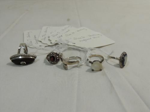 LOT 5 STERLING SILVER RINGS, GARNET, WEDGEWOOD, SHELL, WOOD STONES. AS SHOWN. VIEW PICTURE FOR DETAIL.