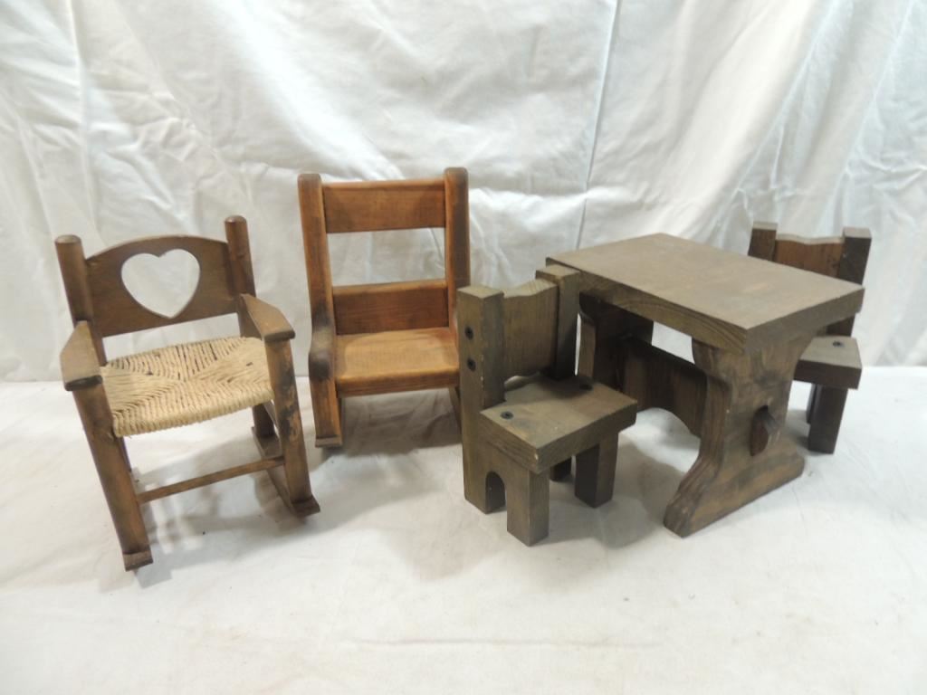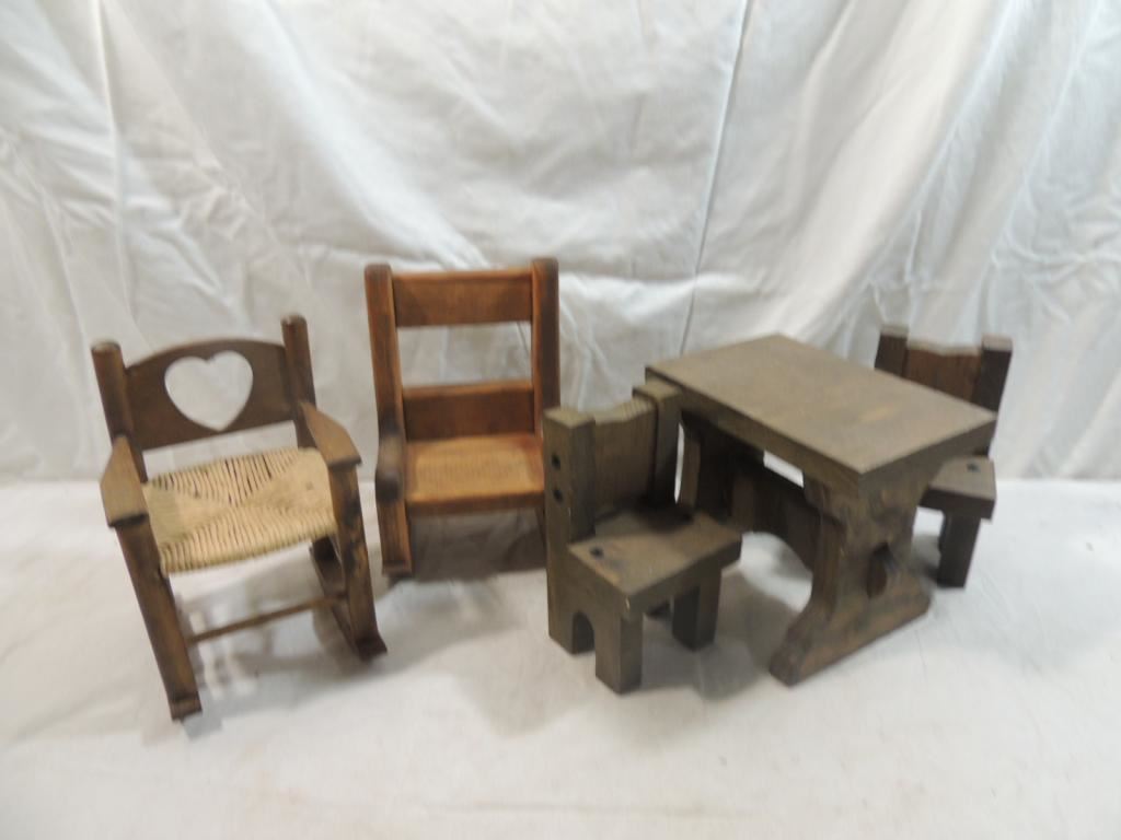 DOLL CHAIRS, DOLL TABLE AND CHAIRS, ACCESSORIES, VINTAGE ACCESSORIES, DARK FINISH, COLLECTIBLE FURNITURE, AS SHOWN SEE PHOTO FOR MORE DETAILS.