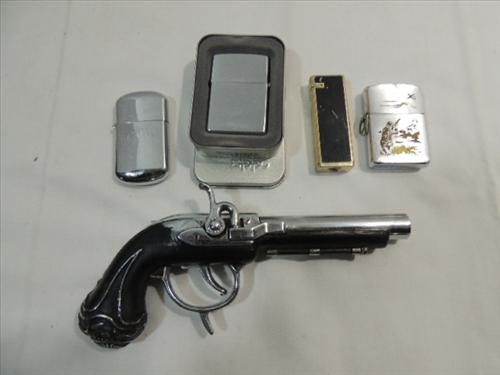 LOT 5 TOBACIANA CIGARETTE LIGHTERS: (2) ZIPPO, DUALING PISTOL & MORE. AS SHOWN. VIEW PICTURE FOR DETAIL.