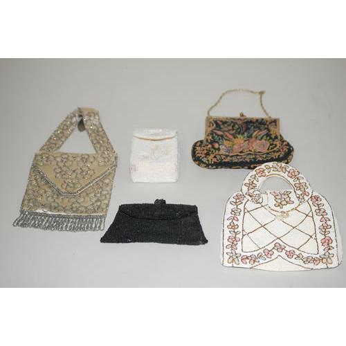 LOT (5) VICTORIAN LADIES ACCESSORY ITEMS - (1) FLORAL<BR>PETIT POINT BAG, (1) SILK BAG W/ MARCASITE BEADS, (1)<BR>BEADED CIGARETTE CASE, (1) WRIST PURSE & (1)<BR>POLYCHROME BEADED FLORAL DESIGN BAG - VARIOUS WEARS,<BR>LOSSES & IMPERFECTIONS