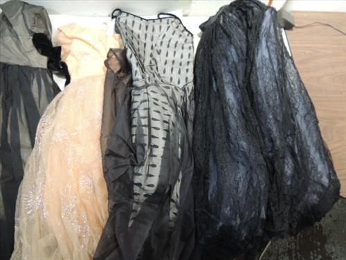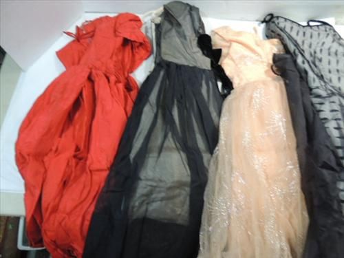 LOT 5 VINTAGE 1950S LADY'S FORMAL BALL PROM DRESSES. VERY POOFY. AS SHOWN. VIEW PICTURE FOR DETAIL.