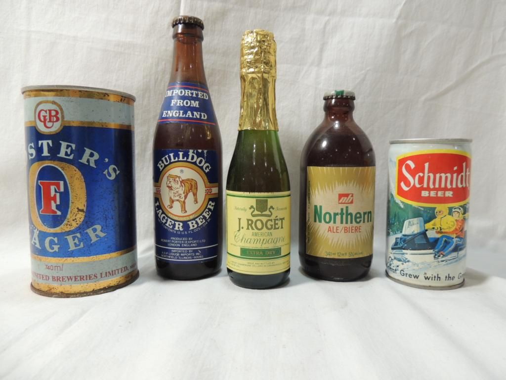 FOSTERS, SCHMIDT, NORTHERN BULL DOG, J ROGET CHAMPANGE. ASSORTED SIZES. VINTAGE BEER CANS. MEMORABILIA. BEER COLLECTIBLE. BREWARANA. MALT LIQUOR. RARE CANS. AS SHOWN. SEE PHOTO FOR MORE DETAILS.
