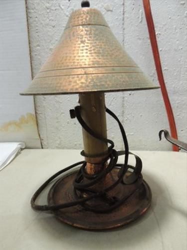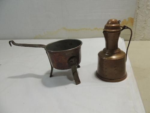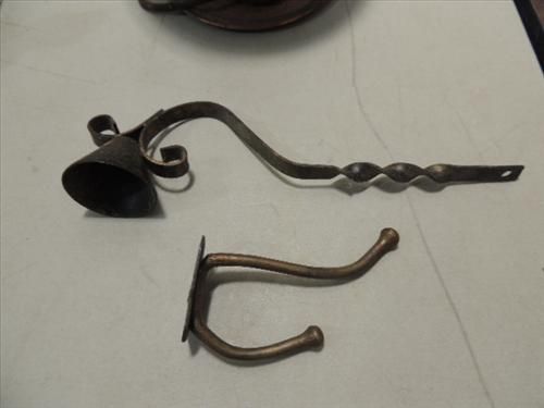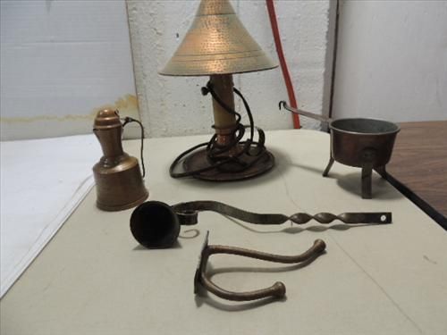 LOT 5 VINTAGE ASSORTED COPPER ITEMS: 1920S HAMMERED COPPER SIDE LIGHT, CANDLE SNUFFER, COAT HOOK, AND MORE. AS SHOWN. VIEW PICTURE FOR DETAIL.