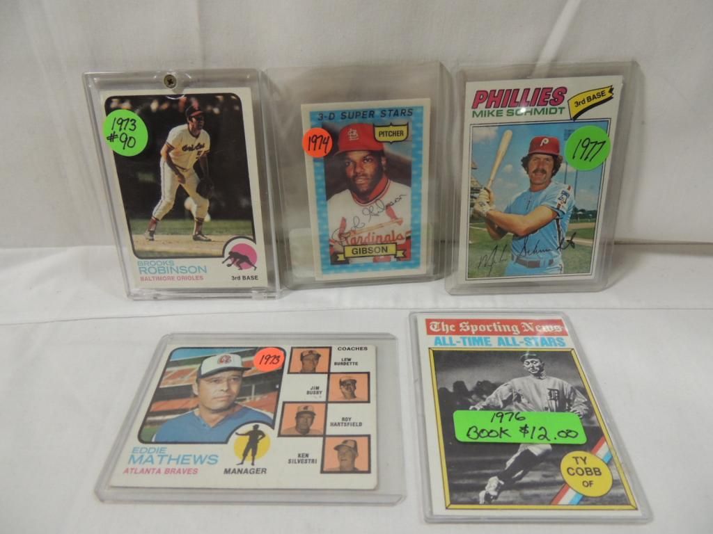 BROOKS ROBINSON, TY COBB, MIKE SCHMIDT, EDDIE MATTHEWS, BOB GIBSON. AS SHOWN. GOOD CONDITION. IN BINDER SHEET. BASEBALL PLAYER CARDS. TRADING CARDS. AS SHOWN. SEE PHOTO FOR MORE DETAILS.