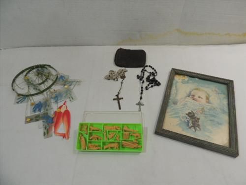 LOT 5 VINTAGE COLLECTIBLES: 2 VERY OLD ROSARIES, MINIATURE SET HAND CARVED MANGER SCENE FIGURES, AND VINTAGE GLASS WIND CHIME. AS SHOWN. VIEW PICTURE FOR DETAIL.