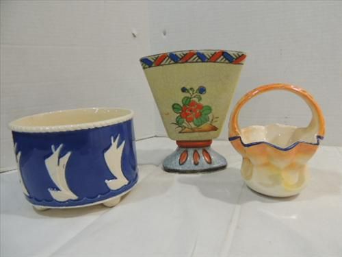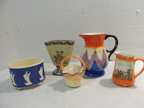 LOT 5 VINTAGE CZECHSLOVAKIAN CERAMICS: 2 PITCHERS, VASE, BASKET AND BOWL. AS SHOWN. VIEW PICTURE FOR DETAIL.