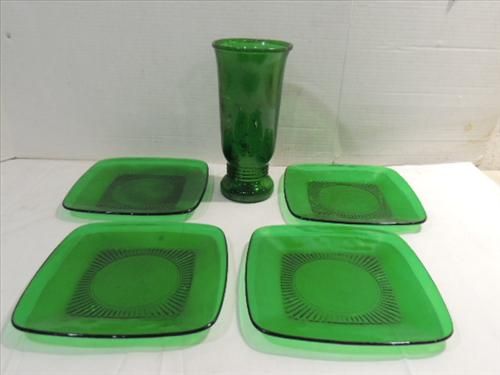 LOT 5 VINTAGE EMERALD GREEN GLASS: 4 SQUARE PLATES & VASE. AS SHOWN. VIEW PICTURE FOR DETAIL.