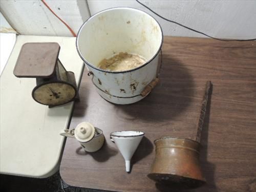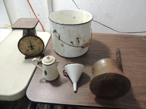 LOT 5 VINTAGE ENAMAL WARE: 12"D LARGE KETTLE, 1 SMALL COFFEE POT (INDIVIDUAL SIZE), 1 ENAMAL FUNNEL, 1 LARGE COPPER DIPPING LADEL WITH IRON HANDLE & HANSEN WEIGH-MASTER SCALE. AS SHOWN. VIEW PICTURE OFR DETAIL.