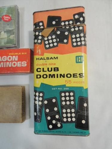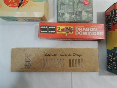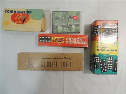 LOT 5 VINTAGE GAMES: 2 SETS OF DOMINOES, 1 CRIBBAGE BOARD, TWO DECK OF CARD AND POKER CHIPS. AS SHOWN. VIEW PICTURE FOR DETAIL.