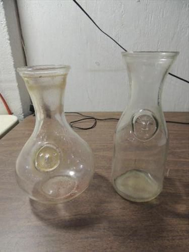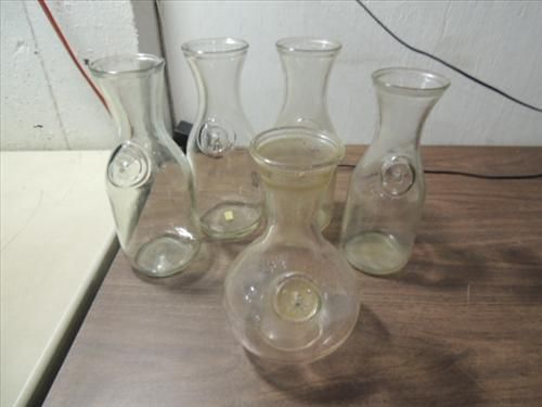 LOT 5 VINTAGE GLASS WINE DECANTERS. AS SHOWN. VIEW PICTURE FOR DETAIL.