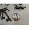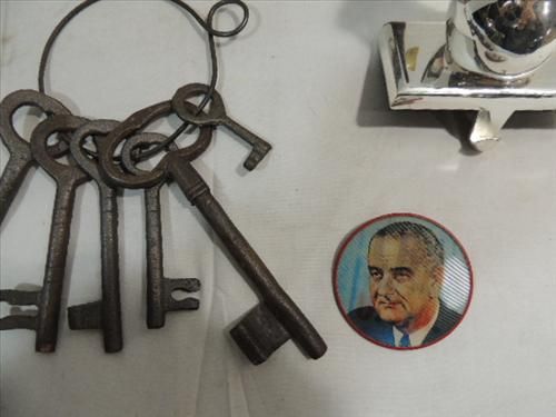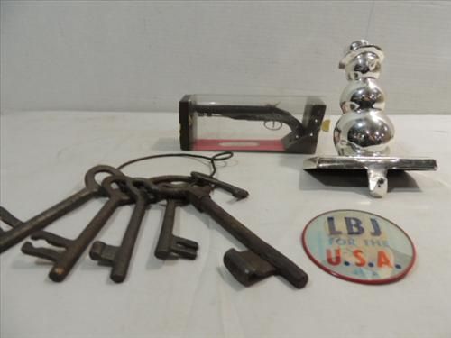 LOT 5 VINTAGE ITEMS: POLITICAL BUTTON VARIVUE LBJ, CAST METAL CHROME SNOWMAN STOCKING HOLDER, KEY RING WITH REPRODUCTION KEYS, AND REPLICA MINIATURE FLINT LOCK PISTOL. AS SHOWN. VIEW PICTURE FOR DETAIL.