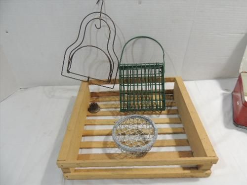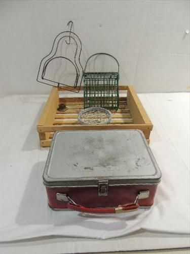 LOT 5 VINTAGE ITEMS: PRESSED METAL LUNCH BOX, 2 WIRE FRAME SMALL BASKETS, ALL IN A WWOOD CRATE. AS SHOWN. VIEW PICTURE FOR DETAIL.