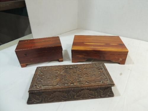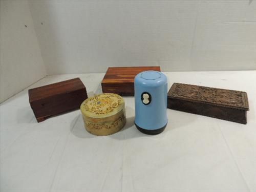 LOT 5 VINTAGE JEWELRY BOXES: 2 CEDAR WOOD BOXES, 1 BURWOOD ORNATE CARVED BOX AND MORE. AS SHOWN. VIEW PICTURE FOR DETAIL.