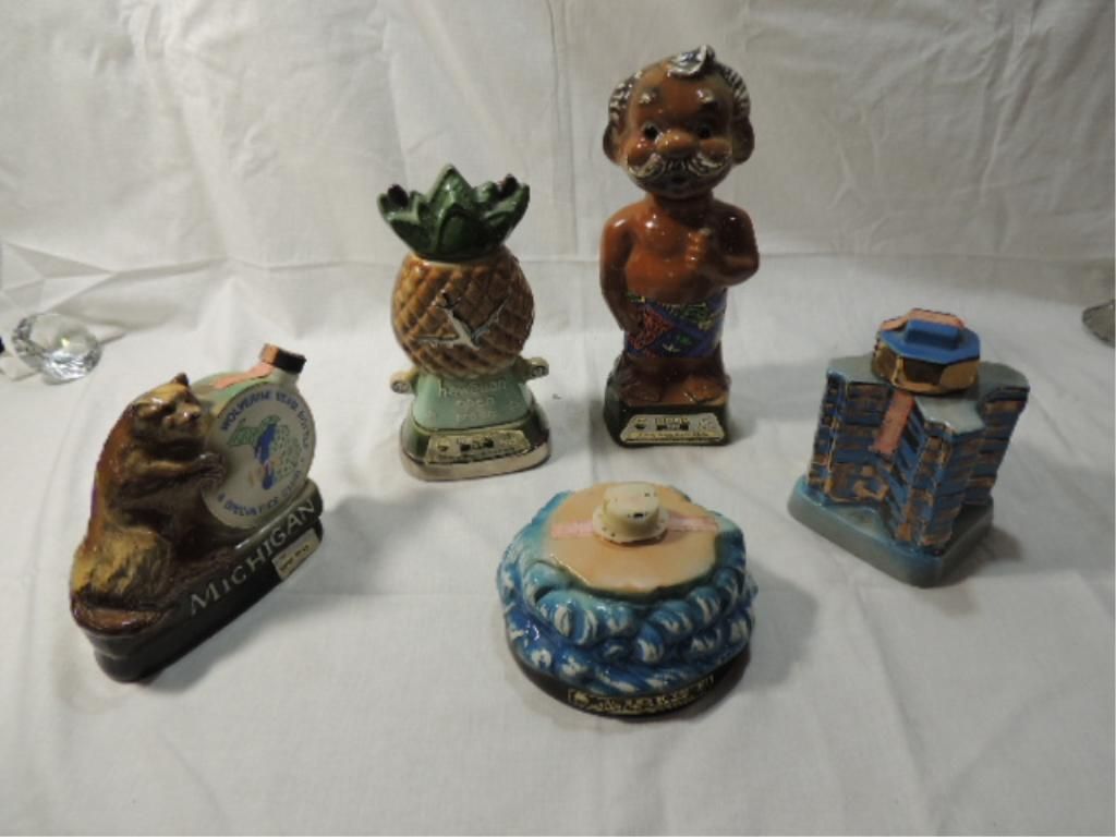 LOT 3 VINTAGE JIM BEAM WHISKEY CERAMIC DECANTERS: 1975 HYATT REGENCY NEW ORLEANS, 1975 MICHIGAN AND 1984 PARTIAL 14TH IAJBBC CONVENTION. 1972 GOLF HAWAIIAN OPEN, 1975 GOLF 10TH ANNV HAWAIIAN OPEN (HAS SMALL CHIP ON HEAD). AS SHOWN. VIEW PICTURE FOR