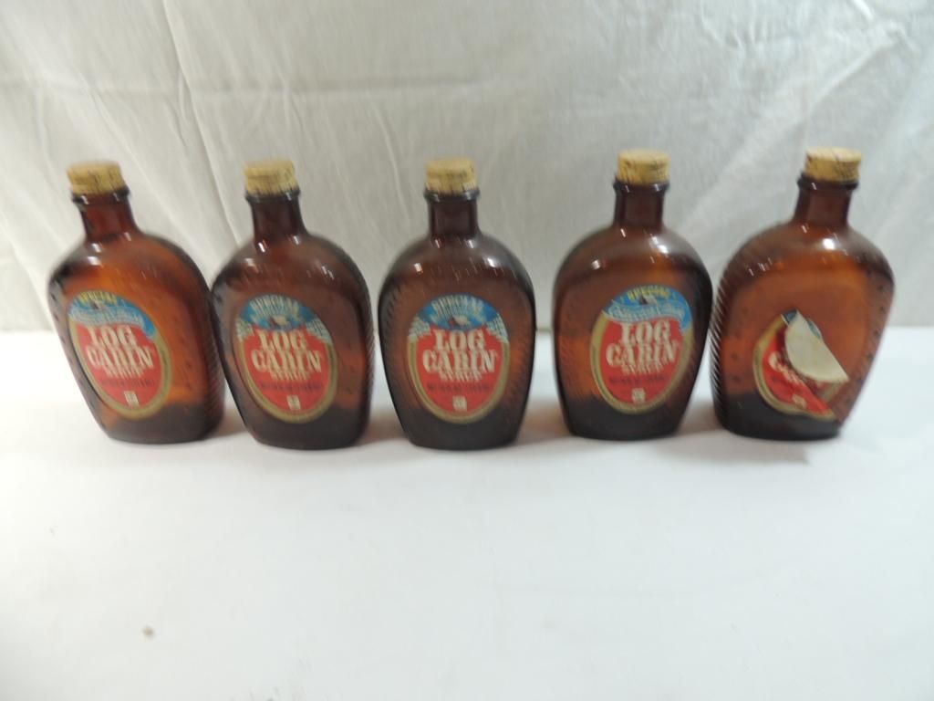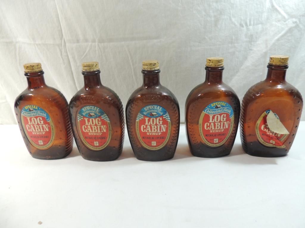 VINTAGE LOG CABIN SYRUP BOTTLES 1976 COLLECTORS FLASK AMBER GLASS BOTTLES AS SHOWN SEE PHOTO FOR MORE DETAILS.
