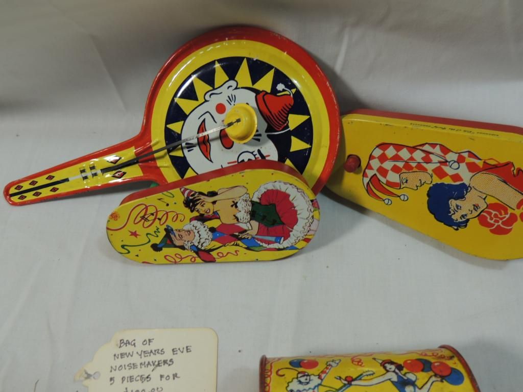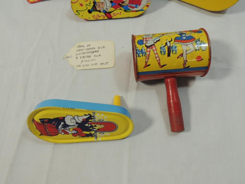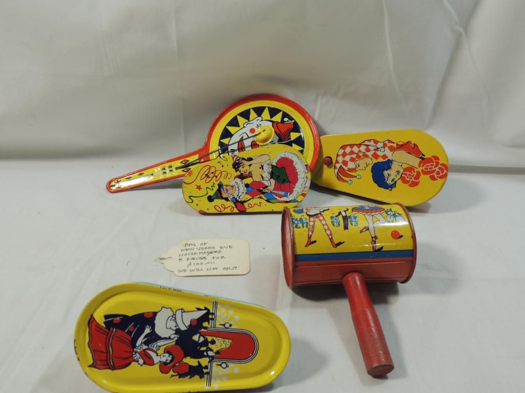 NEW YEARS EVE NOISEMAKERS. VINTAGE TIN NOISEMAKERS. CELEBRATION NOISE MAKERS. AS SHOWN. SEE PHOTO FOR MORE DETAILS.