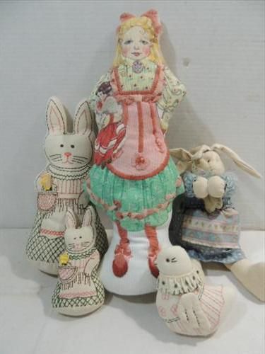 LOT 5 VINTAGE PLUSH CLOTH DOLLS (3) RABBITS, LITTLE BIRD & VICTORIAN GIRL. AS SHOWN. VIEW PICTURE FOR DETAIL.