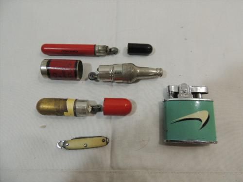 LOT 5 VINTAGE TOBACIANA (4) LIGHTERS: NEWPORT OMEGA LIGHTER, (3) FRICTION CIGARETTE LIGHTERS AND ONE SMALL PEN KNIFE. AS SHOWN. VIEW PICTURE FOR DETAIL.