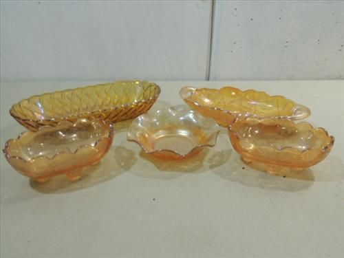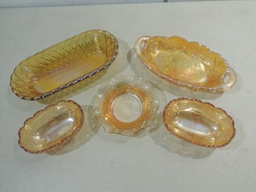 LOT 5 VINTAGE UNMARKED AMBER CARNIVAL GLASS ITEMS: 4 BANANA BOATS, 1 RUFFLED BOWL. AS SHOWN. VIEW PICTURE FOR DETAIL.