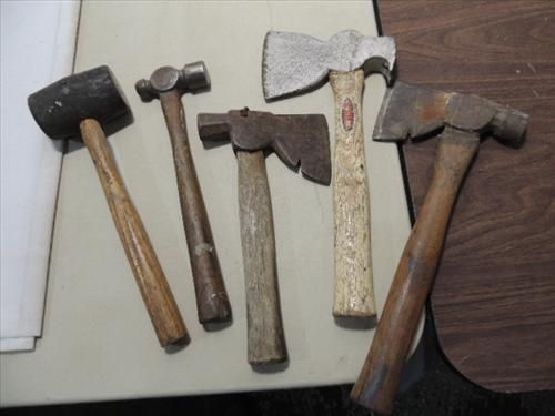 LOT 5 VINTAGE WOOD HANDLED MALLET, HATCHETS & HAMMER. AS SHOWN. VIEW PICTURE FOR DETAIL.